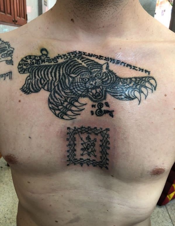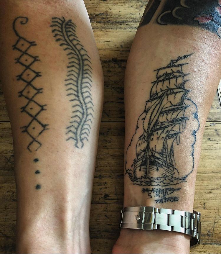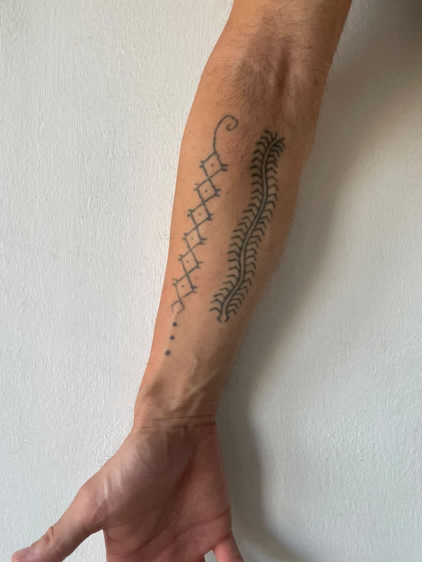 Ci sono tatuati dei baffi stilizzati per ricordare un amico che ora non c’è più e anche due iniziali di ben due ex-mogli di cui una scritta in lingua indiana. Segni che sono qui e che resteranno lì perché fanno parte della mia vita, sono il mio passato e tutti i miei ricordi.”