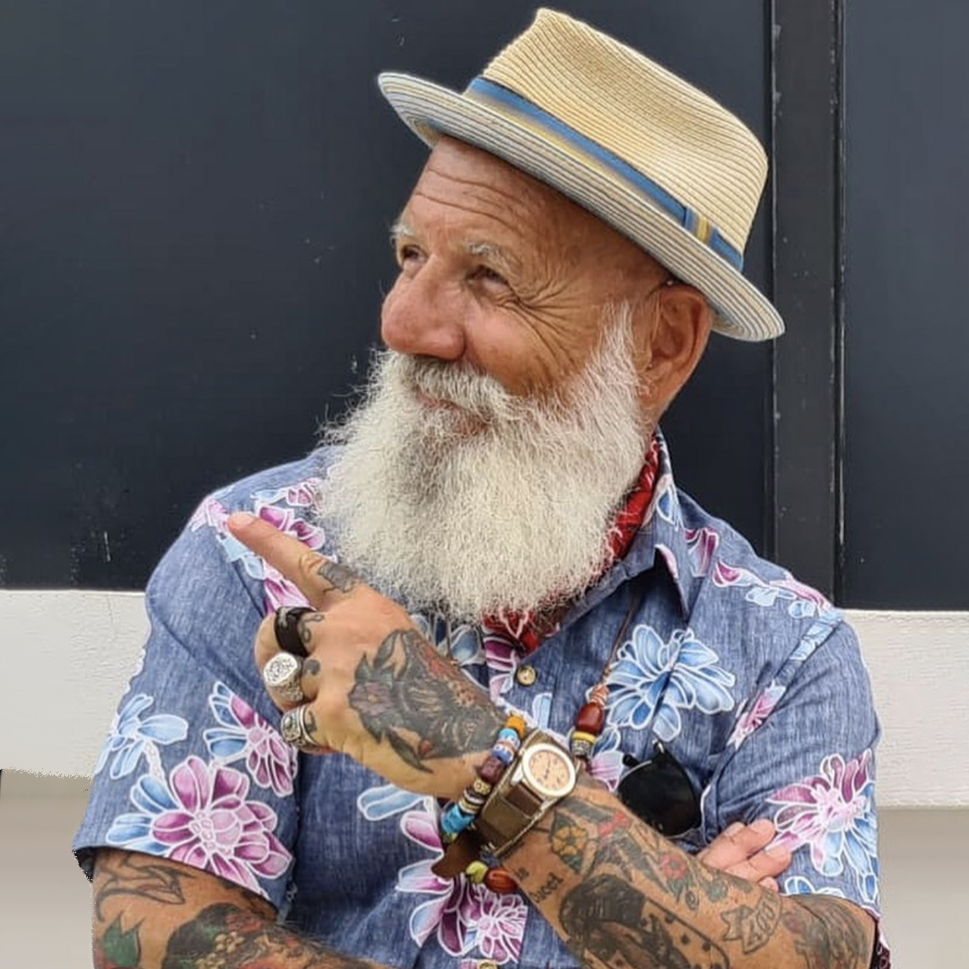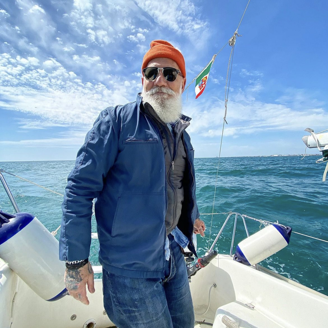 Emilio a colpo d’occhio è un personaggio in simbiosi con il suo spazio, fazzoletto intorno al collo, lunga barba bianca, un buon Levis 501 addosso con tanto di scarponi in pelle ai piedi, camicia, bracciali colorati, orologio vintage al polso, una coppola in testa e le braccia piene di tatuaggi.